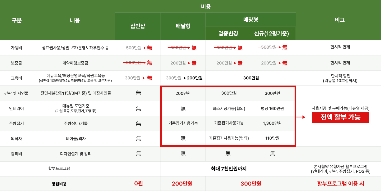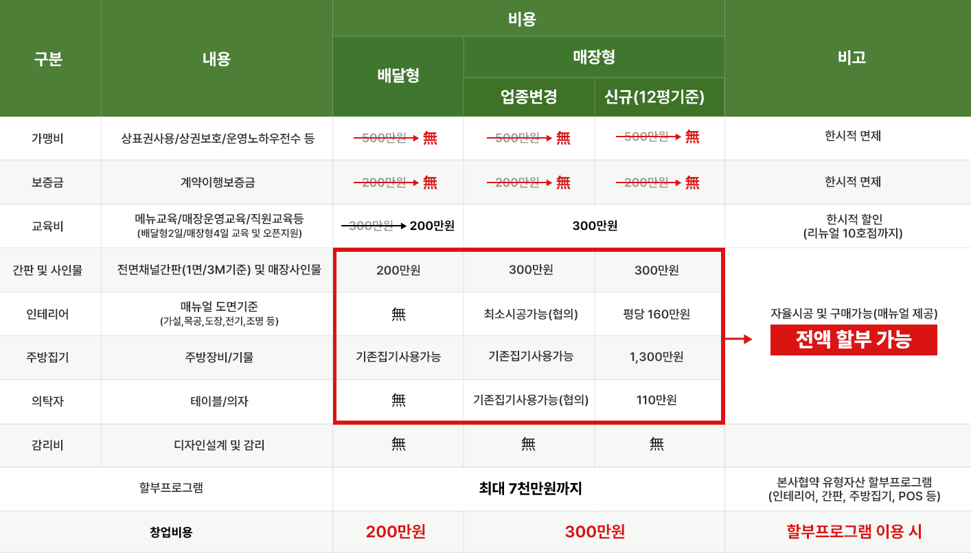 ※ 위 사항은 점포여건상 변동 가능합니다. (철거, 외부공사, 주방설비공사, 전기승압, 냉난방, POS비용은 별도)